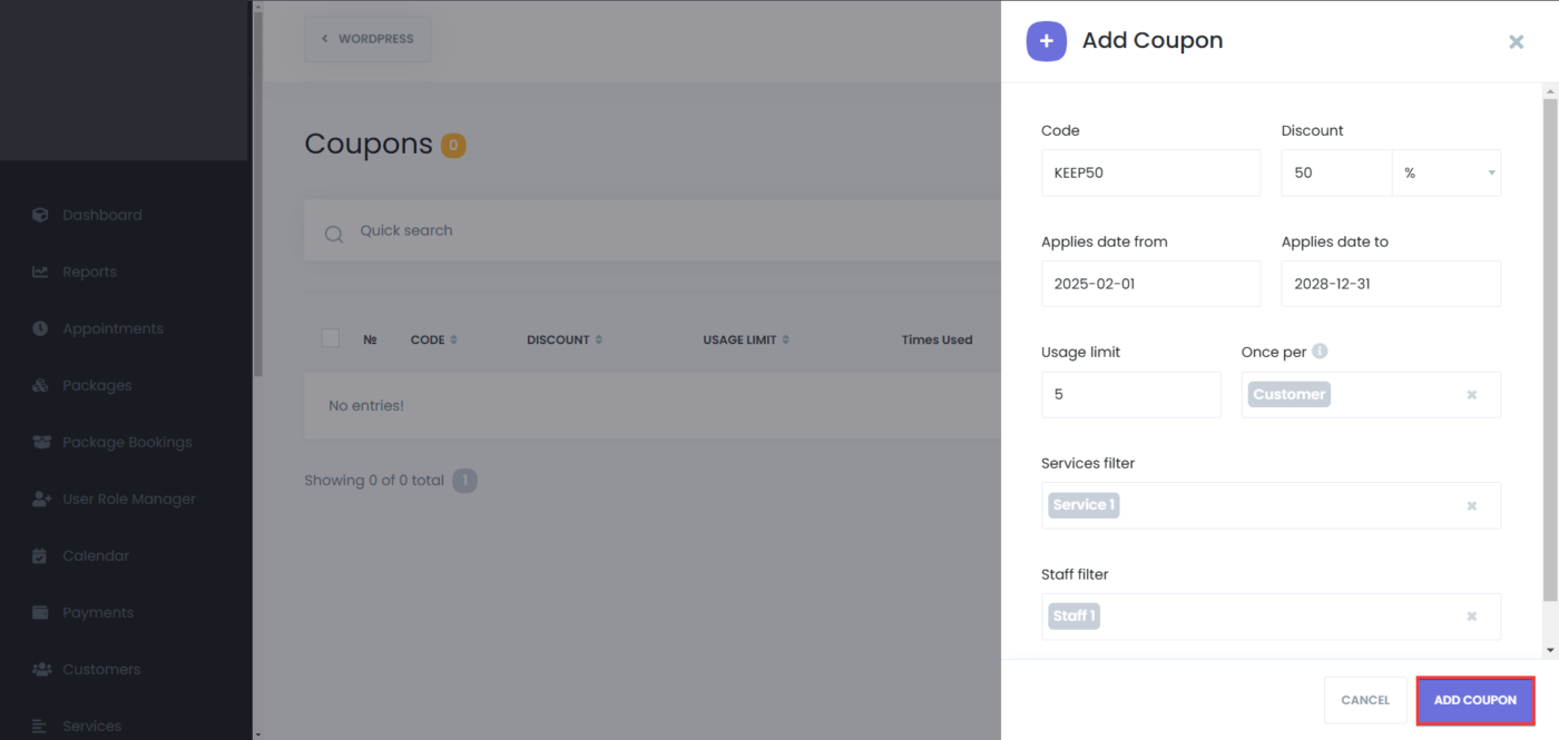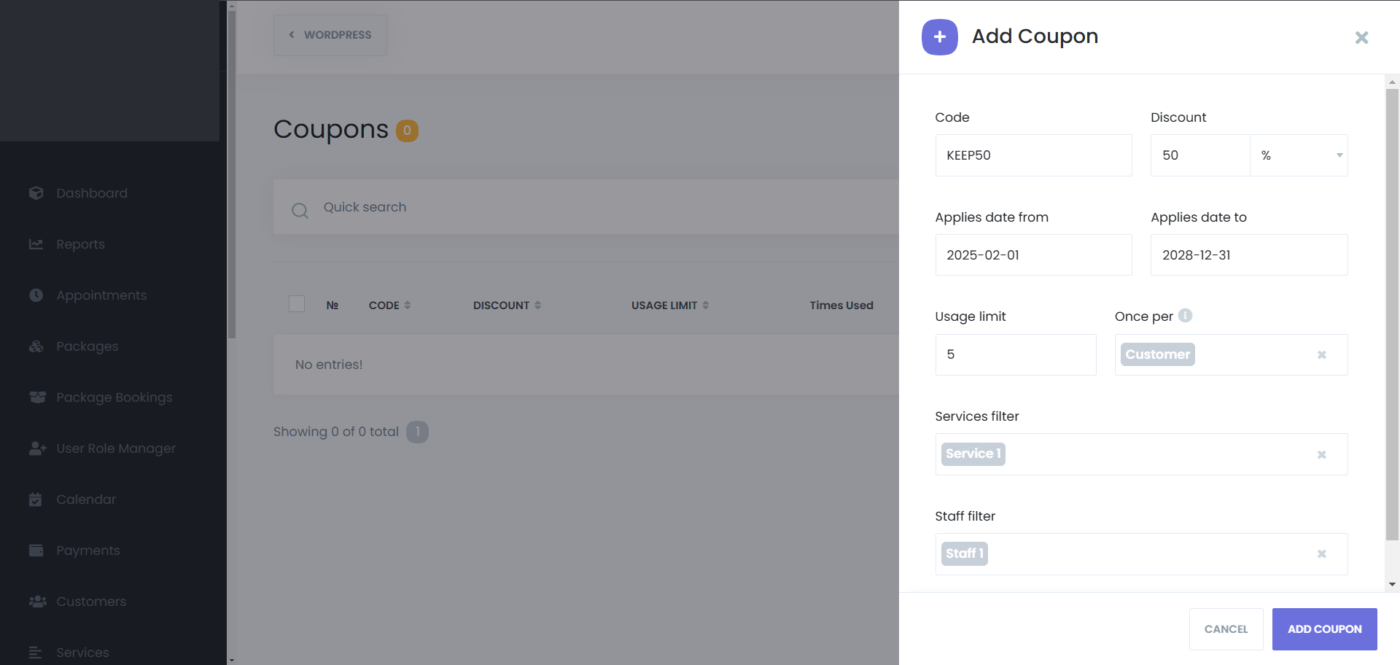 - Services Filter: Select specific services to which the coupon applies. Leave empty to allow the coupon for all services.
