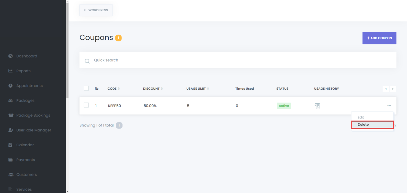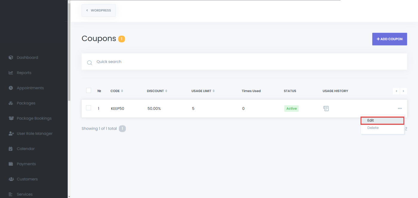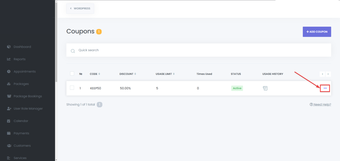 - In the coupons list, click the options icon (three dots) next to the desired coupon.