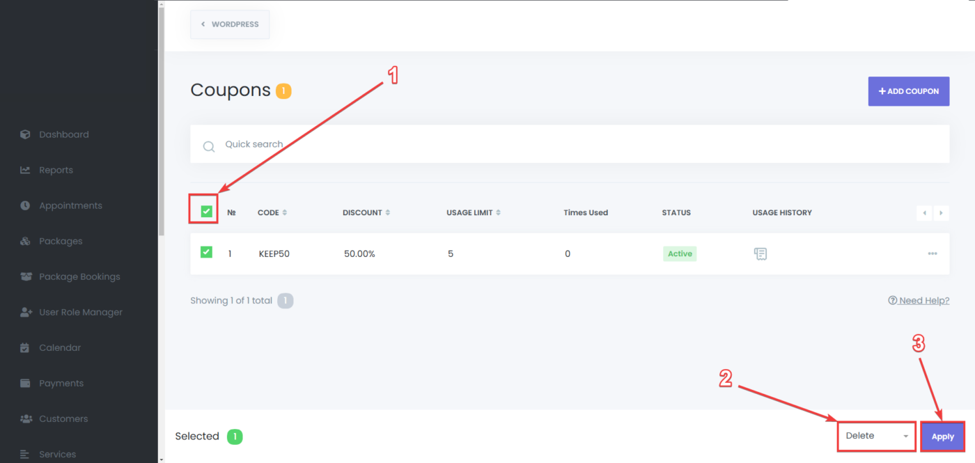 For bulk deletion, select multiple coupons using the checkboxes, select the action “Delete” and click the “Apply” button at the bottom.