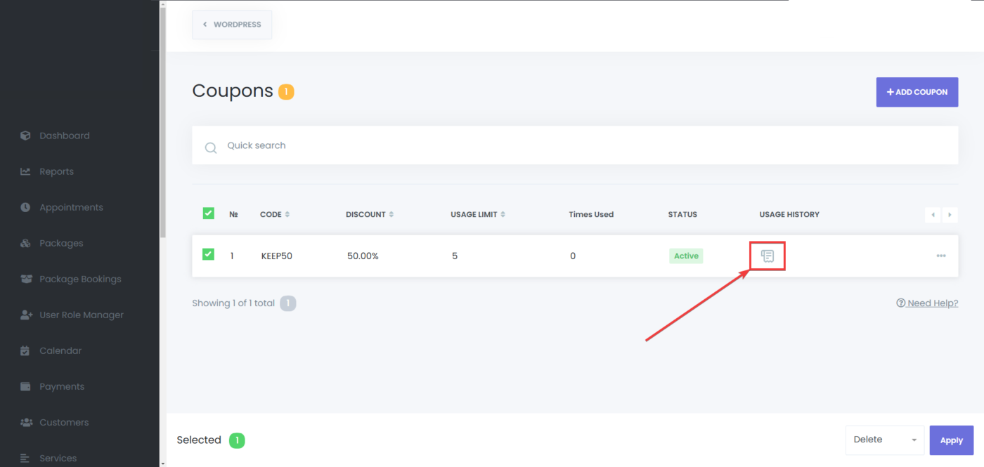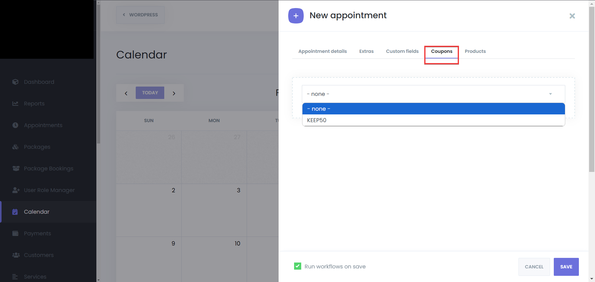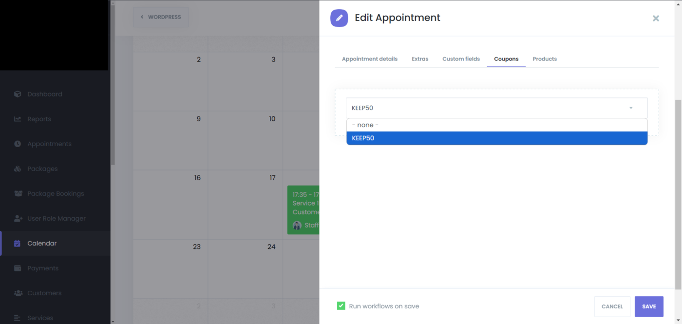 After that, go to the “Coupons” tab, and select the coupon that you want to use for that appointment, and click on save: