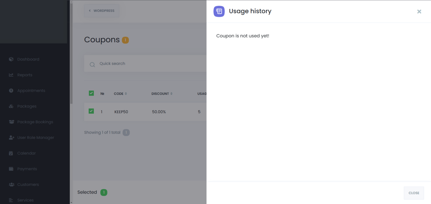 If there’s an appointment that should not have the coupon discount, but there is already a coupon added to that appointment, you can remove the coupon easily. To do so, you should go to the Appointments menu, or the Calendar module, find the appointment that you’re looking for, edit it, go to the “Coupons” tab, and select the “- none -” option: