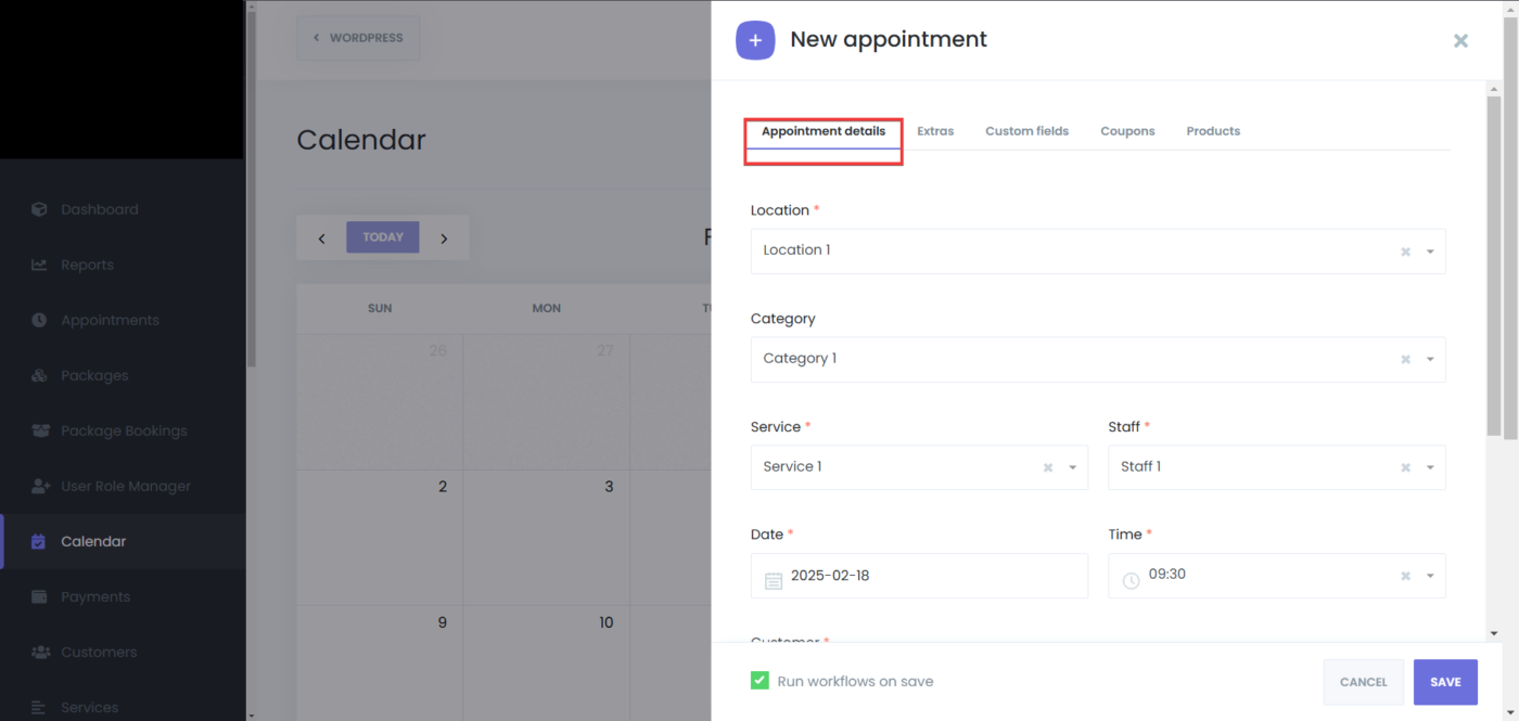 Select the mandatory options from the “Appointment details” tab: