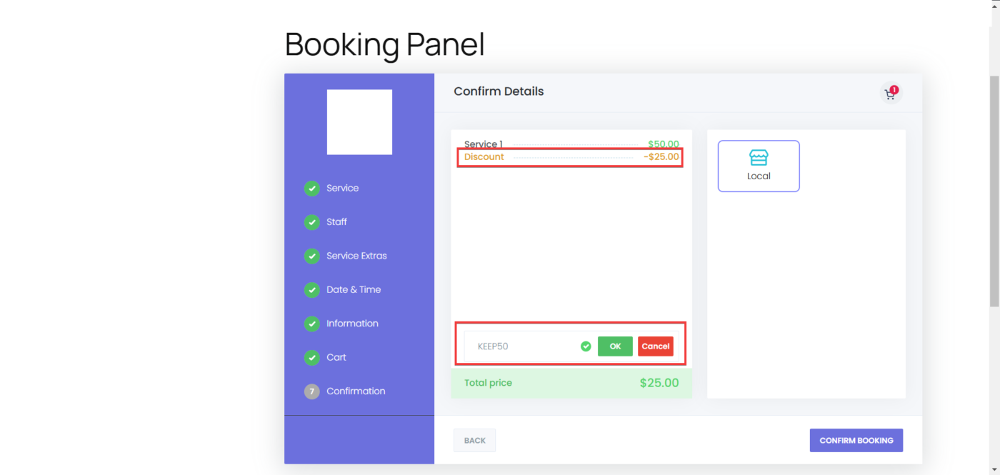 - Go to the booking panel, continue with the steps, reach the Confirmation step