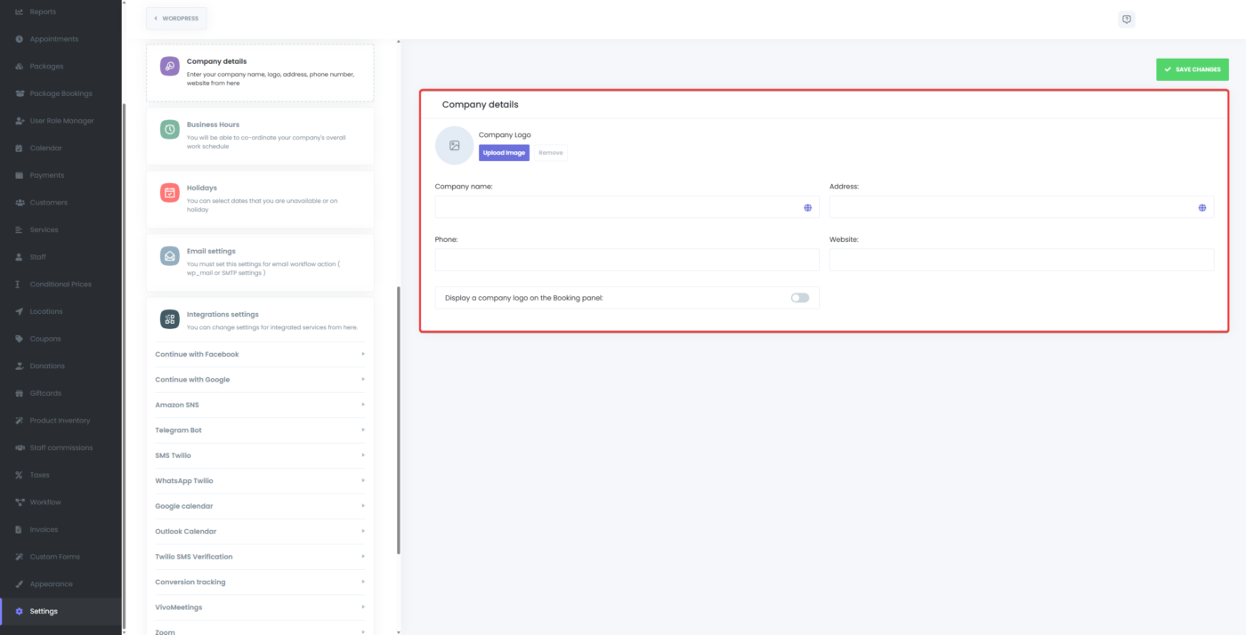 The Business Details Settings section in Bookissa is where you define the foundational identity of your business within the booking system. These details personalize the front-end booking experience for your clients and appear across various system-generated communications, such as email notifications and invoices.