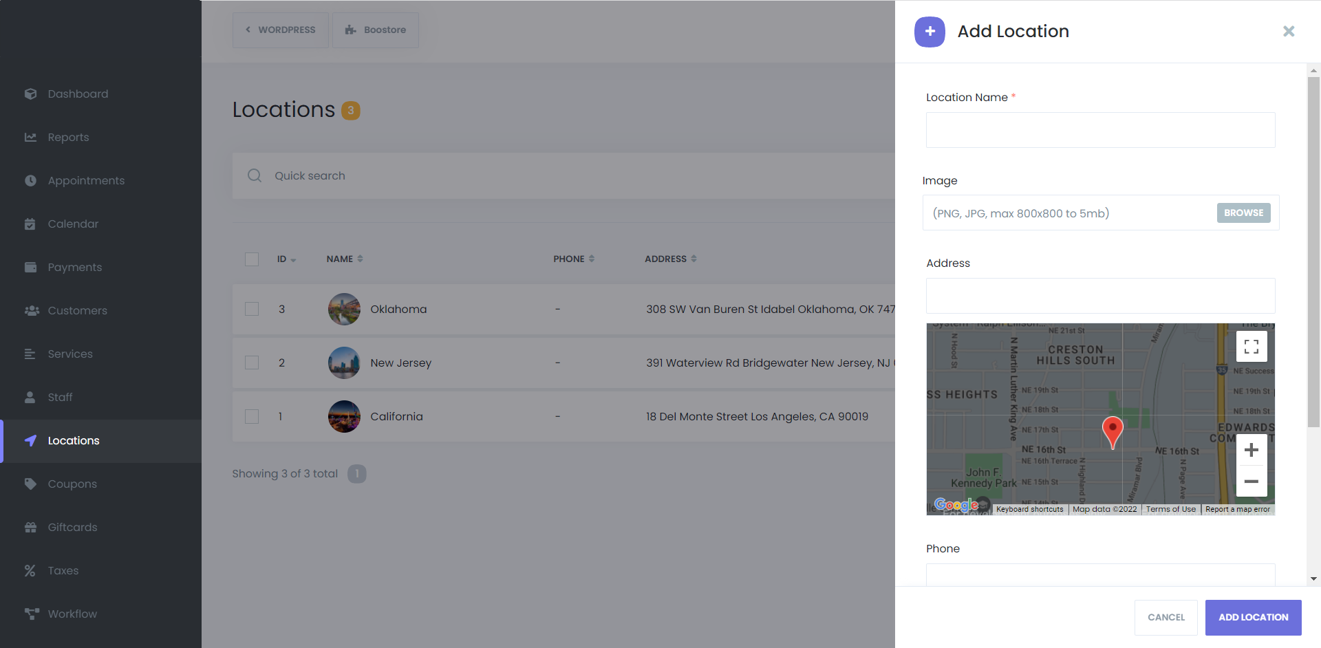 Please enter the location’s name, add an image, write the Address, and choose it from the map in the opening window. Enter the phone number and note a short description.