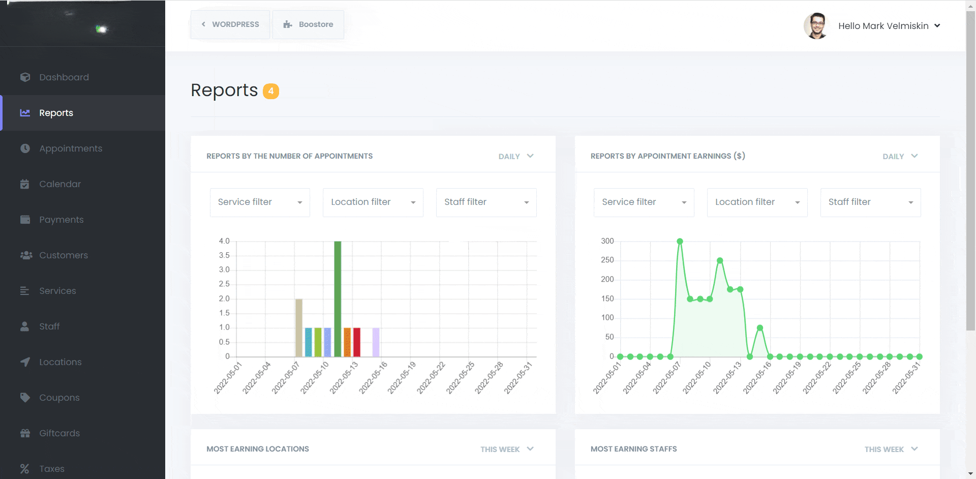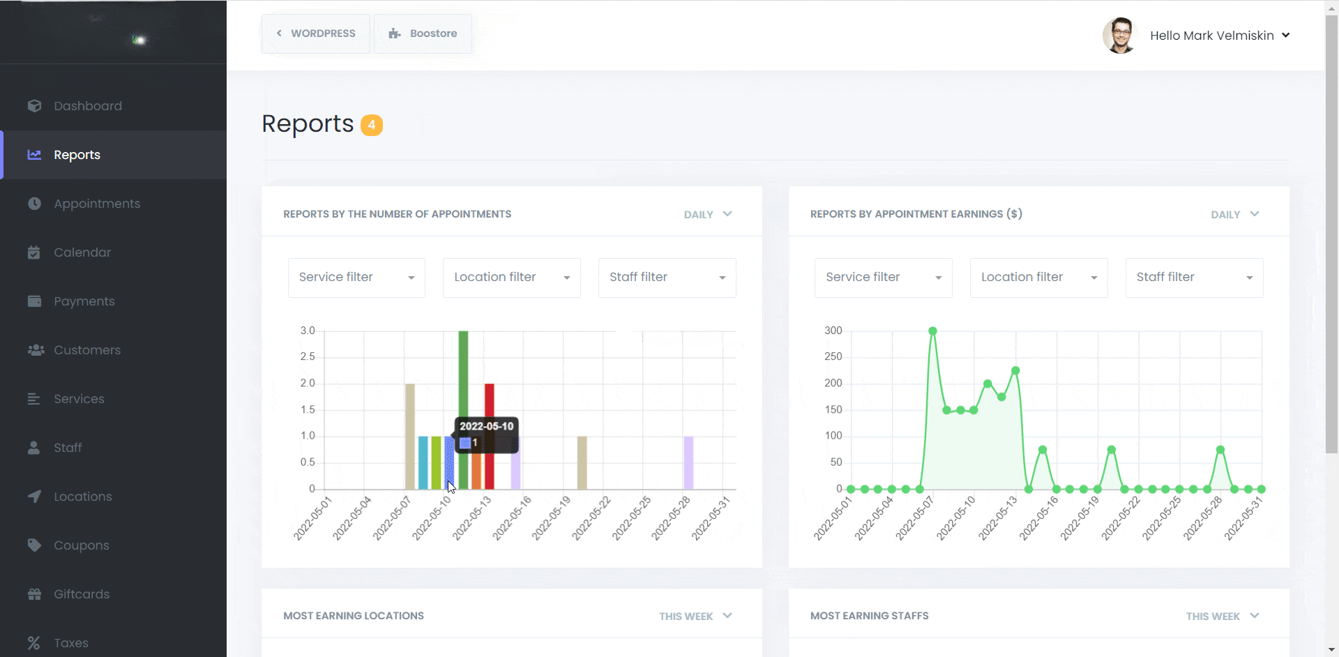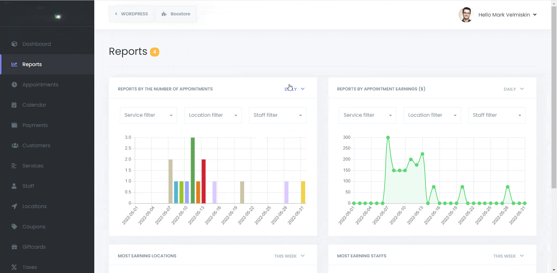 Service, location, and staff filters can be applied to see the exact information on graphs.