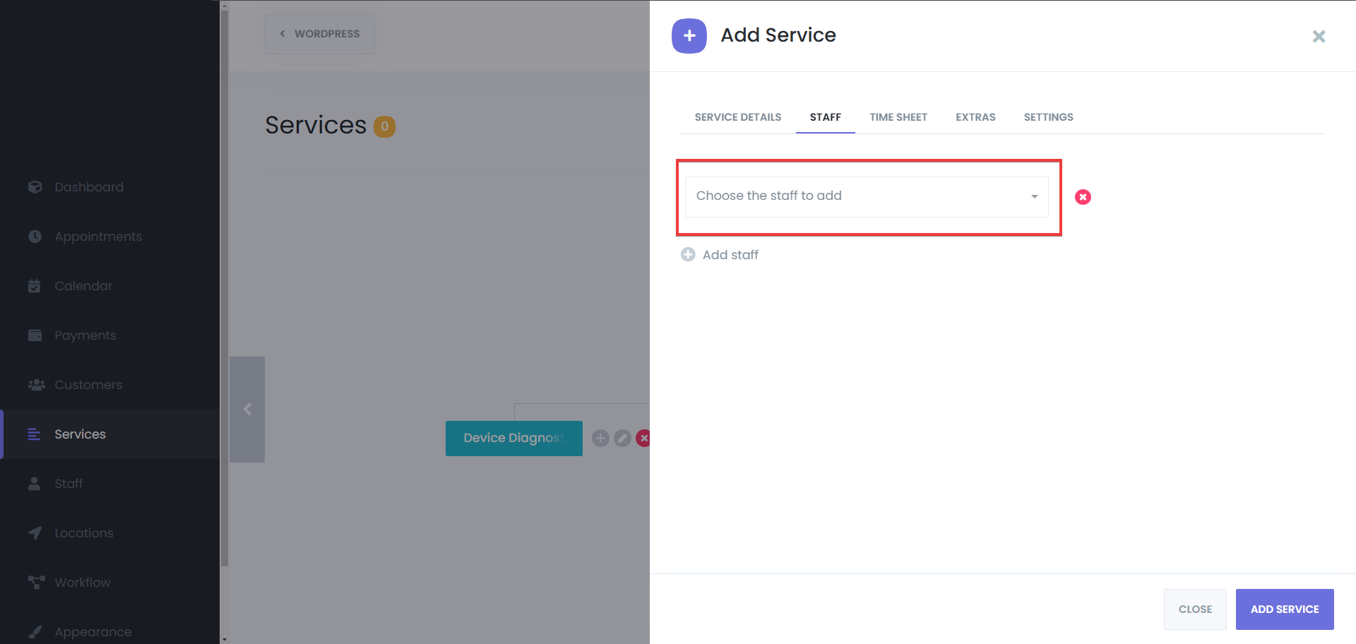 - In the service settings panel, go to the Staff tab.