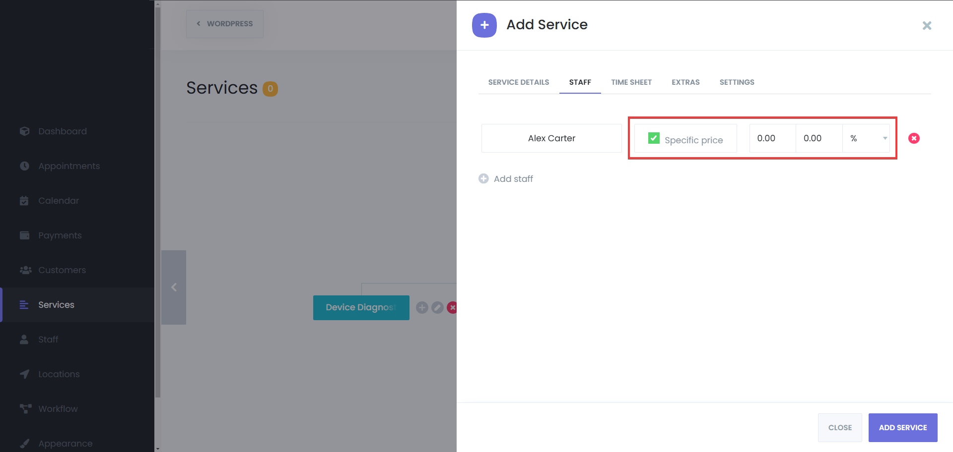 - If different staff members charge different rates for the same service, you can set staff-based pricing under the pricing section.