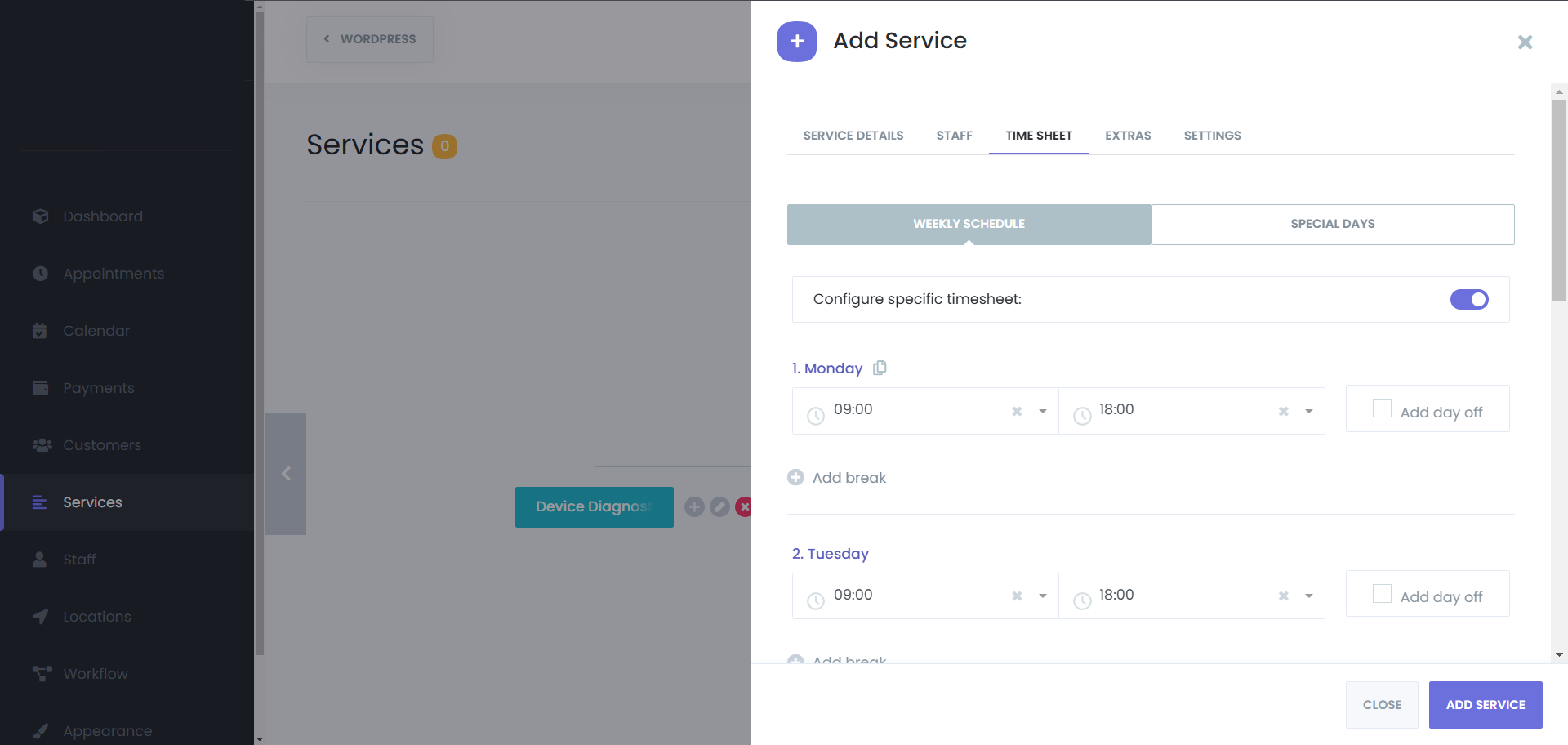 Please also take into consideration that, if you configure weekly schedule for a service, it will override your business hours settings in the general settings. And if you set up a specific working hours for a staff, and assign this service to that staff, then the staff’s working hours will override your service specific weekly schedule. Therefore, the priority is as such: